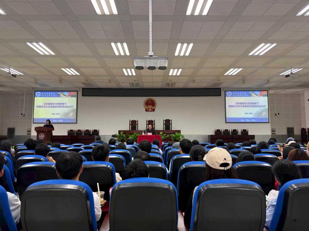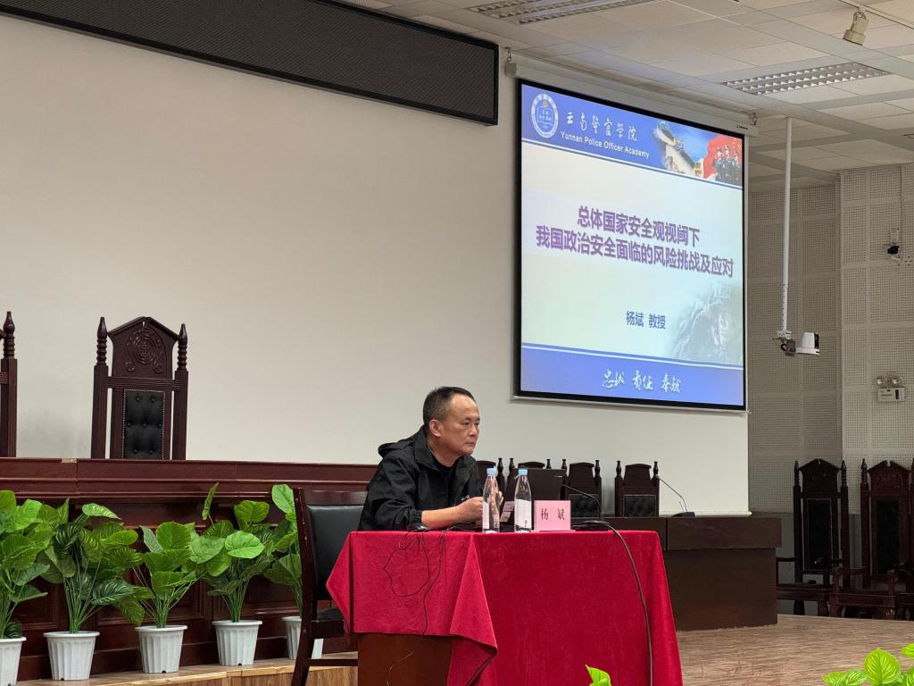 杨斌教授深耕国家安全、反恐怖、民族宗教、边疆稳定等领域教学研究多年,兼具深厚的理论功底与丰富的实践经验,是全国公安系统优秀教师、国家社科基金项目成果优秀鉴定专家,其专业素养和研究成果在行业内具有广泛影响力。讲座中,杨斌教授围绕“总体国家安全观视阈下我国政治安全面临的风险挑战及应对”这一核心主题,结合自身研究实践,系统阐释了贯彻总体国家安全观的重大意义,重点解读了当前存在的各类风险挑战,并结合典型案例让在场师生对国家安全面临的现实威胁有了更为清醒的认知。同时,杨斌教授结合专业研究,针对性提出了防范化解各类安全风险的具体举措,为师生党员应对安全挑战、履行安全责任提供了科学指导和实践路径。