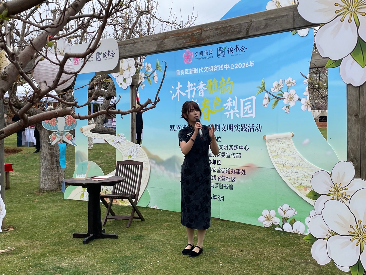 活动现场,梨花园内春意盎然,主持人首先介绍了冰心先生的文学成就及其作品“爱的哲学”核心思想,随后专业演员分饰的“青年冰心”与“老年冰心”,在梨花林中以情景朗诵和音乐伴奏演绎冰心经典作品,使文字与哲思随春风沁入心田,实现了读者与文学大师的跨时空对话。在阅读分享环节,同学们依次诵读《寄小读者・跨越时空的默庐来信》,在字里行间触摸冰心作品中那份穿越时代依然动人的力量,这不仅是一次文学阅读,更是一场关于爱与责任、关于青春与理想的自我叩问。最后,为增强思政引领力,活动特别邀请呈贡区理论宣讲人才库的优秀宣讲员代表来到梨园,为同学们带来贴近时代、贴近青年的精彩分享,将家国情怀、价值追求与青春奋斗有机融合,引导大家在文学浸润中坚定理想信念。